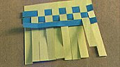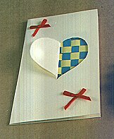 , 用界刀如圖割開半個心形打開成窗口, 用雜色紙條編出長方形如圖示,