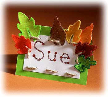 26) 葉子 3: 打印葉子和卡面, 在葉子邊緣上金粉, 用打孔機在卡面打孔, 用粗線把卡面和裁好的賀卡串在一起如圖示即成.